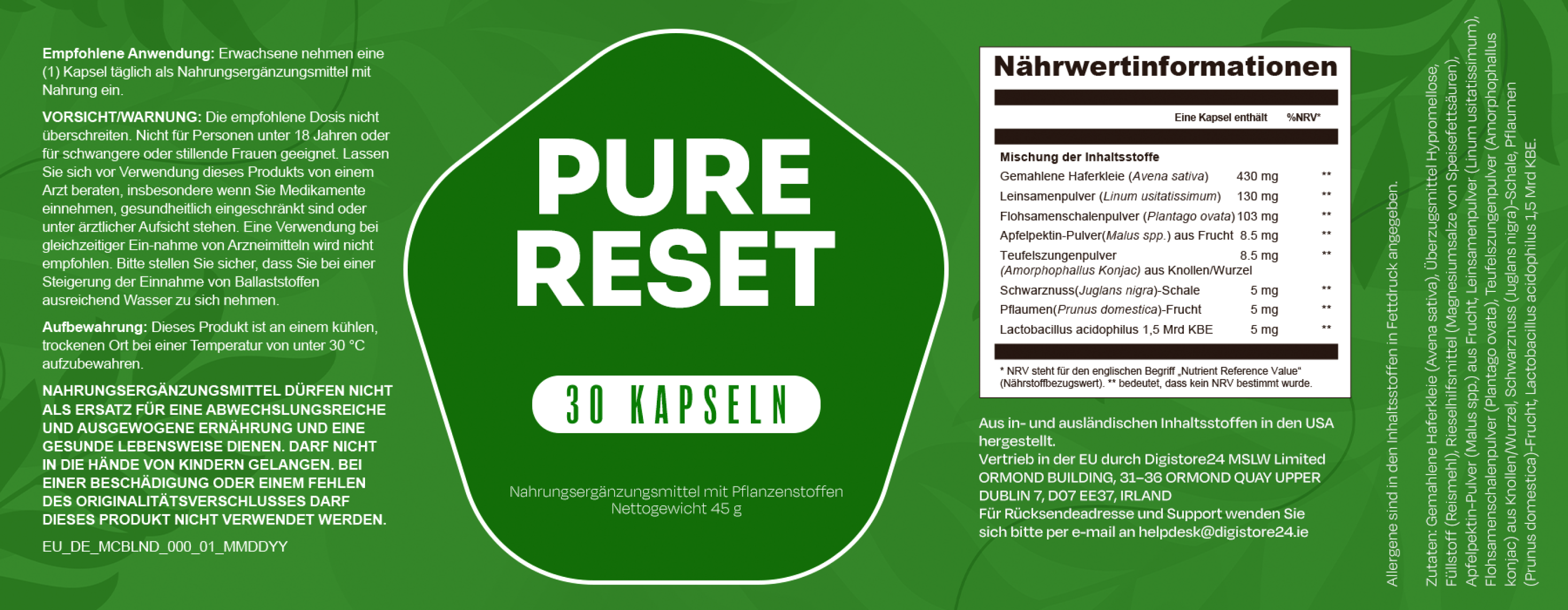 Weitere Inhaltsstoffe: Pflanzliche Kapsel (HPMC), mikrokristalline Cellulose, Magnesiumsalze von Fettsäuren, Siliciumdioxid